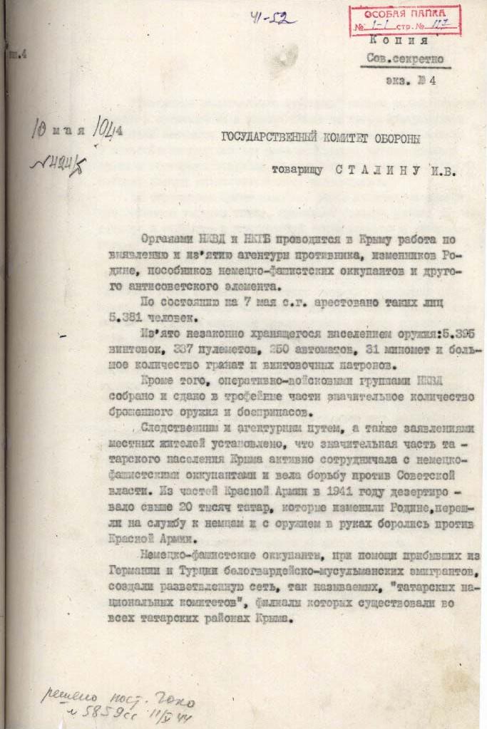 Зі свого боку Лаврентій Берія звітує про роботу Йосипу Сталіну та В’ячеславу Молотову — надсилає донесення про початок операції з депортації кримських татар.