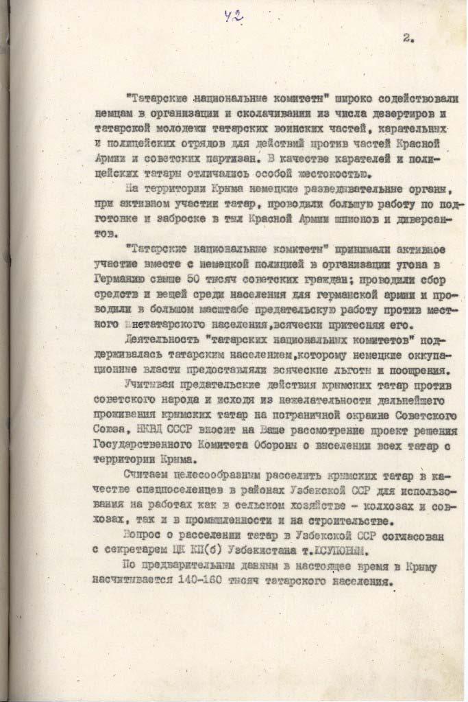 Лаврентій Берія пише листа до Йосипа Сталіна, генерального секретаря Комуністичної партії Радянського Союзу. У ньому він пише, що з 1941 року начебто близько 20 000 кримських татар дезертували з лав Червоної армії, а більша частина населення Криму «активно співпрацювала з німецько-фашистськими загарбниками».