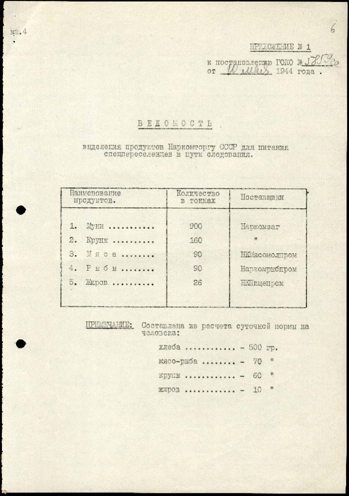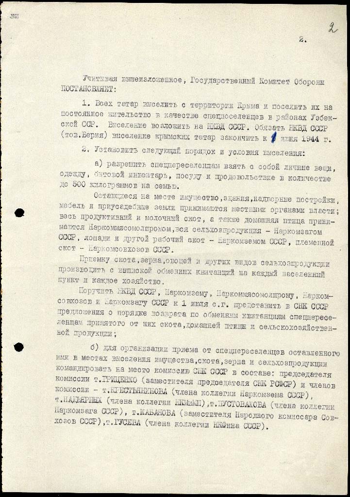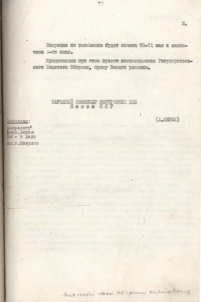 Того дня Лаврентій Берія пише Йосипу Сталіну супровідну записку до проєкту постанови Державного комітету оборони СРСР про направлення депортованих кримських татар на підприємства наркомату целюлозно-паперової промисловості та ліспромгоспи Наркомлісу. Берія пропонує направити туди 30 000 кримських татар.