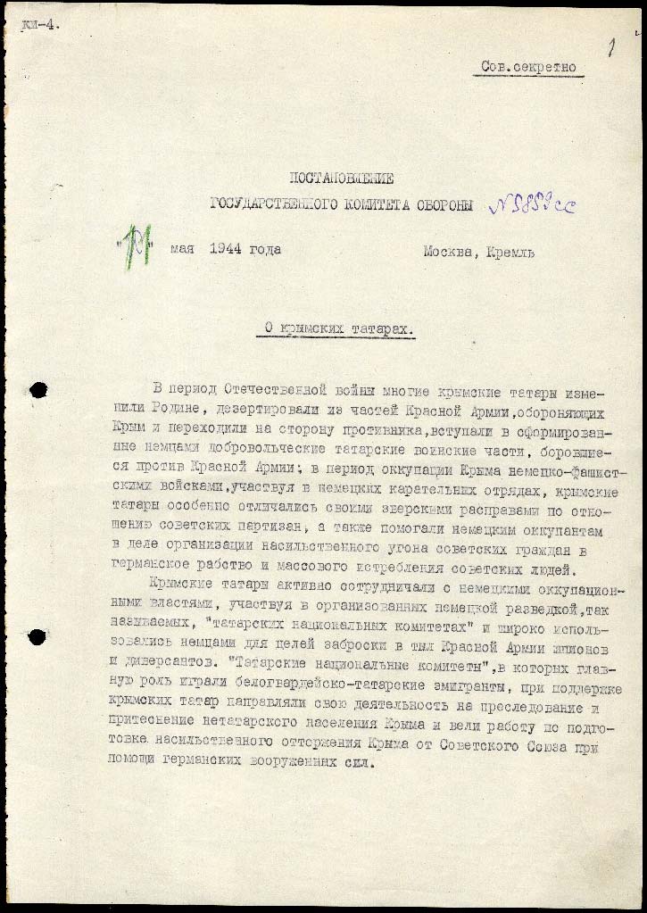 Сталін ухвалює постанову Державного комітету оборони № 5859сс «Про кримських татар». У ній він звинуватив кримськотатарське населення в «державній зраді, масовій колаборації та дезертирстві з лав армії». Через це він постановив переселити всіх кримських татар до Узбецької РСР як «спецпоселенців». Кожній із родин він дозволив узяти не більше 500 кг речей, іншим майном мали розпорядитися представники держави.