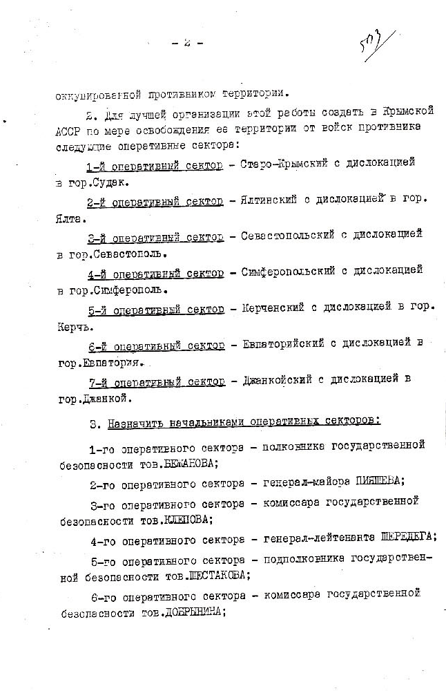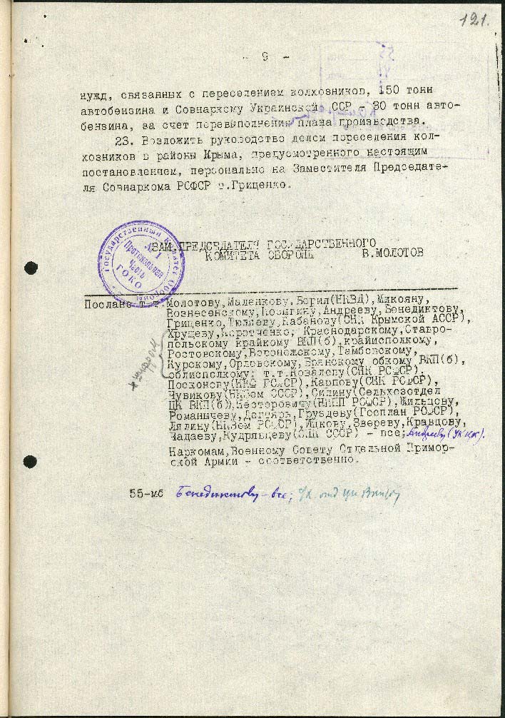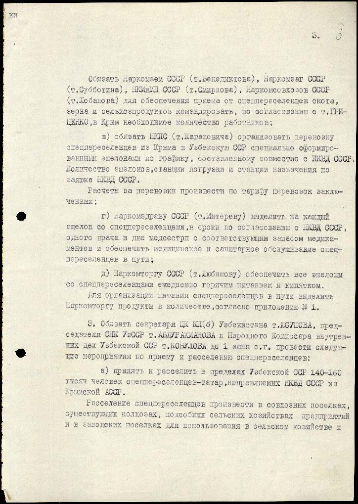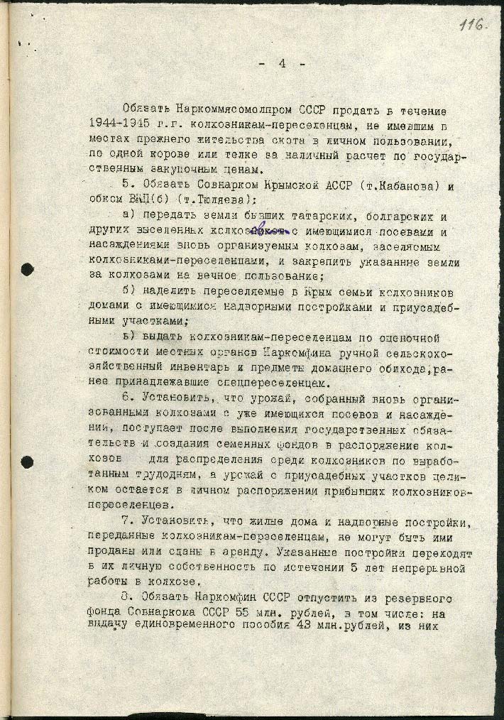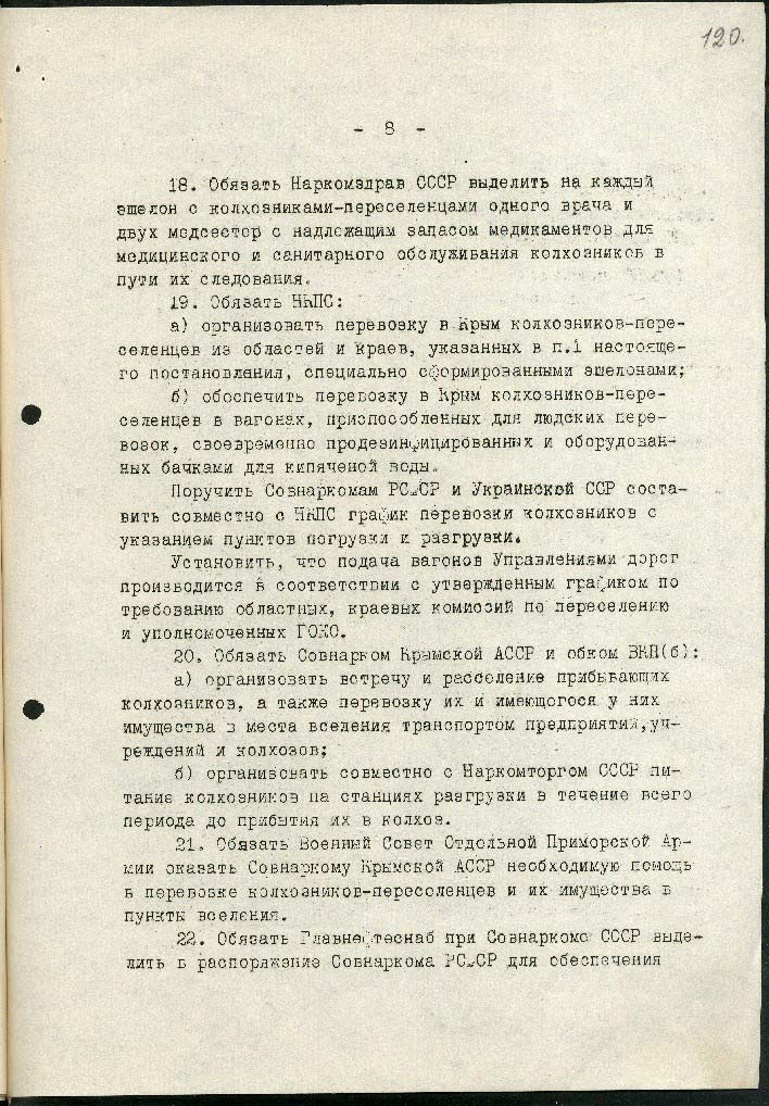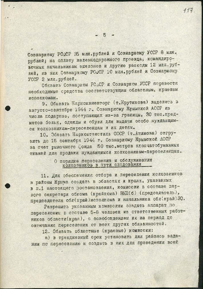 5) дозволити виселити 330 осіб: німців, австрійців, угорців, румунів, італійців, які мешкають у Криму, а також до 1000 повій, які мешкають на курортах та містах Чорноморського узбережжя.