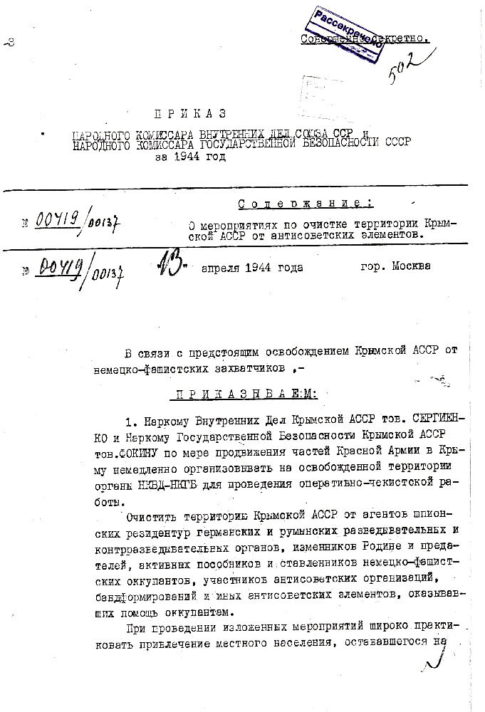 Наказ Берії та Меркулова про «очищення території Криму» від «антирадянських елементів»