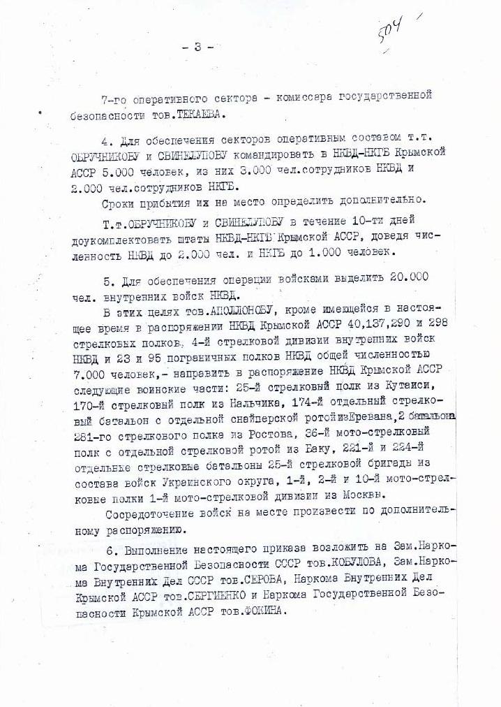 Направляються за Вашою вказівкою в розпорядження тресту «Московвугілля» 8000 осіб спецконтингенту, 5000 ос. також становлять татари. Таким чином, із Кримської АРСР вивезено 191 044 особи татарської національності.