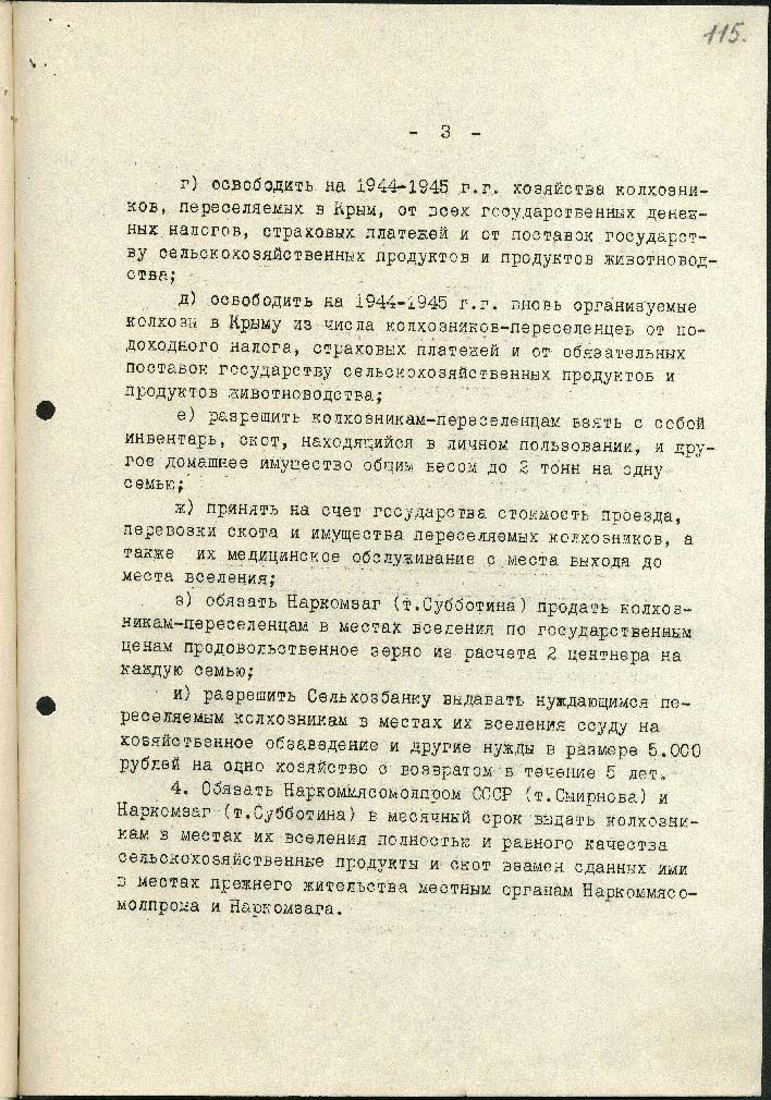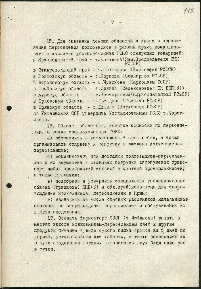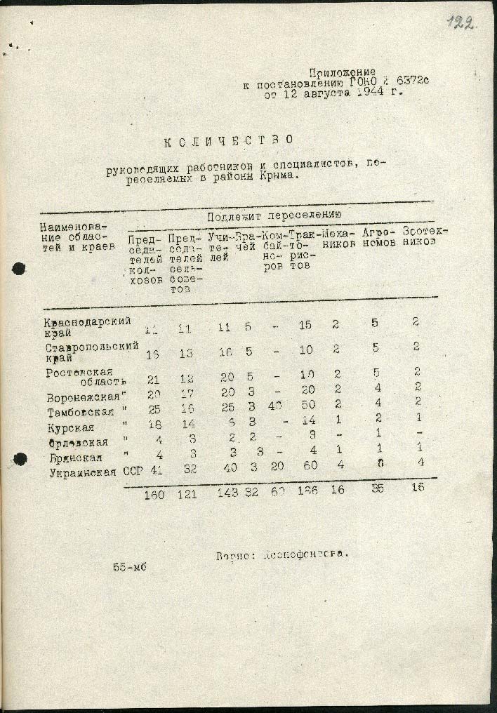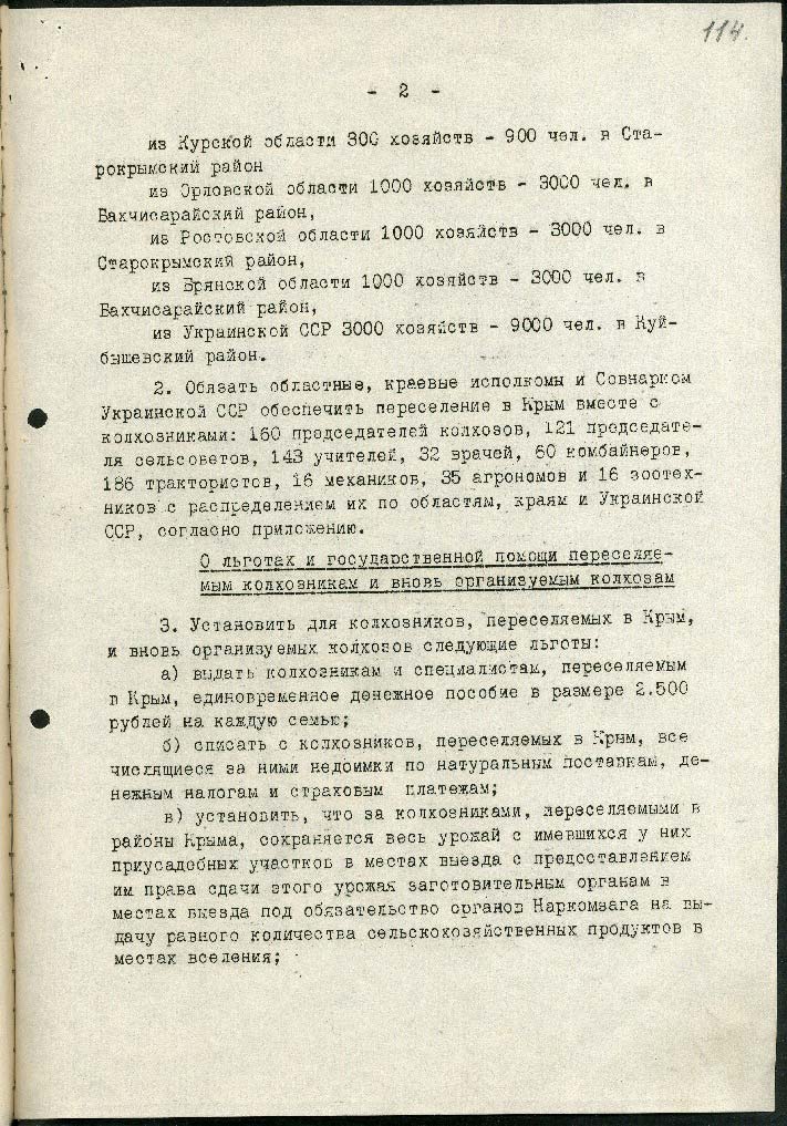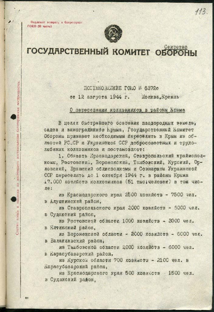 Державний комітет оборони СРСР затвердив постанову «Про переселення колгоспників у райони Криму». Загалом до Криму направили 51 тисячу людей. Окремо прописали умови переселення колгоспників: для них мали виділити їжу на 5 днів дороги, лікарів та медсестер для супроводу. Перевозили колгоспників у вагонах для людей. Згодом таким «переселенцям» надавали пільги, а колгоспи звільняли від оподаткування.